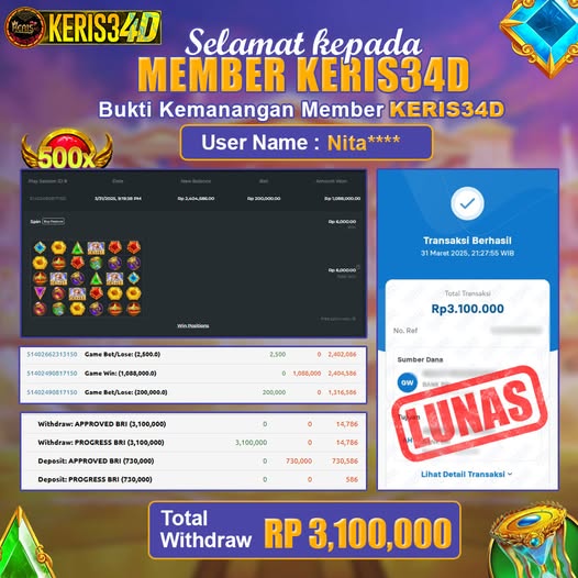 Setiap hari, member KERIS34D berhasil meraih jackpot besar dari berbagai provider slot ternama yang kami sediakan, seperti Pragmatic Play, Habanero, PG Soft, dan masih banyak lagi. Kami secara rutin menampilkan bukti screenshot atau rekapan kemenangan yang berhasil diraih, mulai dari kemenangan ratusan ribu hingga puluhan juta rupiah. Semua slip kemenangan ini kami hadirkan untuk membuktikan bahwa di KERIS34D, peluang menang itu nyata