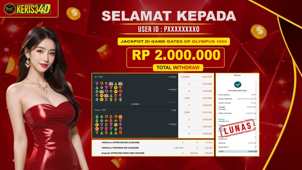 Setiap hari, member KERIS34D berhasil meraih jackpot besar dari berbagai provider slot ternama yang kami sediakan, seperti Pragmatic Play, Habanero, PG Soft, dan masih banyak lagi. Kami secara rutin menampilkan bukti screenshot atau rekapan kemenangan yang berhasil diraih, mulai dari kemenangan ratusan ribu hingga puluhan juta rupiah. Semua slip kemenangan ini kami hadirkan untuk membuktikan bahwa di KERIS34D, peluang menang itu nyata