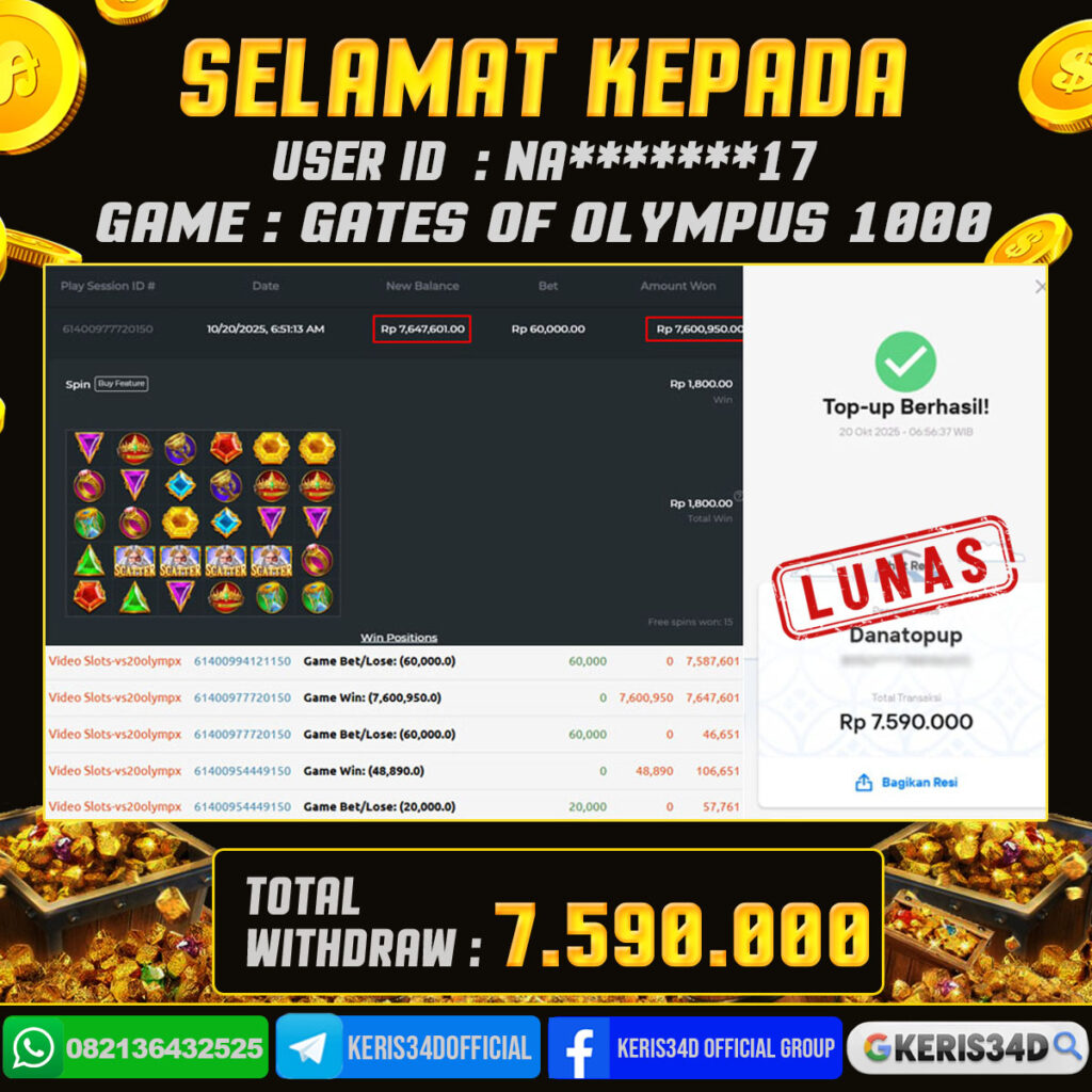 Setiap hari, member KERIS34D berhasil meraih jackpot besar dari berbagai provider slot ternama yang kami sediakan, seperti Pragmatic Play, Habanero, PG Soft, dan masih banyak lagi. Kami secara rutin menampilkan bukti screenshot atau rekapan kemenangan yang berhasil diraih, mulai dari kemenangan ratusan ribu hingga puluhan juta rupiah. Semua slip kemenangan ini kami hadirkan untuk membuktikan bahwa di KERIS34D, peluang menang itu nyata