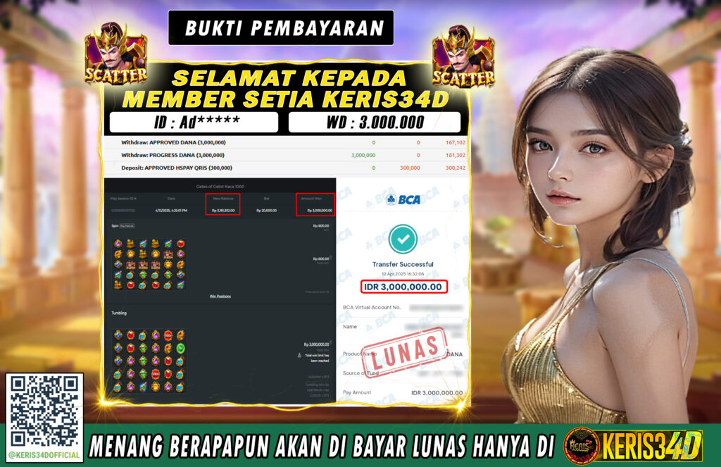 Setiap hari, member KERIS34D berhasil meraih jackpot besar dari berbagai provider slot ternama yang kami sediakan, seperti Pragmatic Play, Habanero, PG Soft, dan masih banyak lagi. Kami secara rutin menampilkan bukti screenshot atau rekapan kemenangan yang berhasil diraih, mulai dari kemenangan ratusan ribu hingga puluhan juta rupiah. Semua slip kemenangan ini kami hadirkan untuk membuktikan bahwa di KERIS34D, peluang menang itu nyata