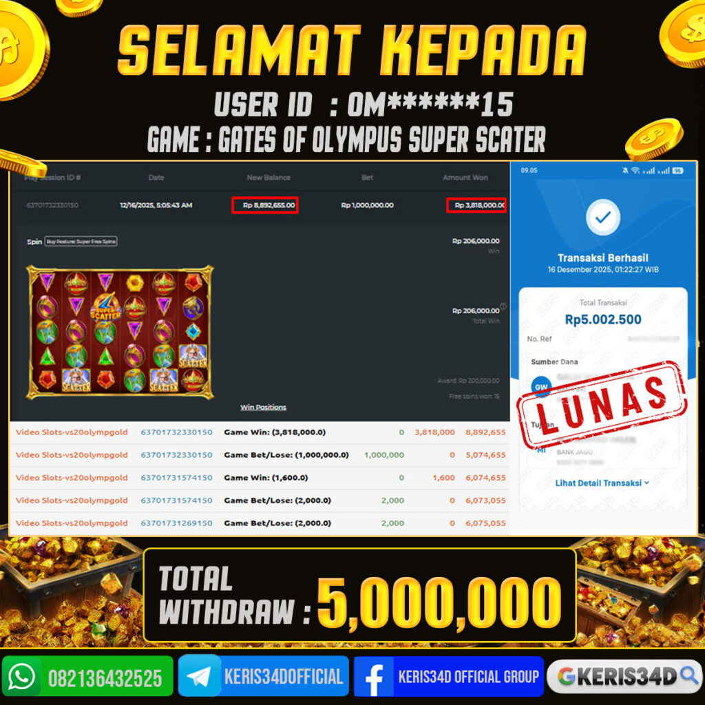Setiap hari, member KERIS34D berhasil meraih jackpot besar dari berbagai provider slot ternama yang kami sediakan, seperti Pragmatic Play, Habanero, PG Soft, dan masih banyak lagi. Kami secara rutin menampilkan bukti screenshot atau rekapan kemenangan yang berhasil diraih, mulai dari kemenangan ratusan ribu hingga puluhan juta rupiah. Semua slip kemenangan ini kami hadirkan untuk membuktikan bahwa di KERIS34D, peluang menang itu nyata