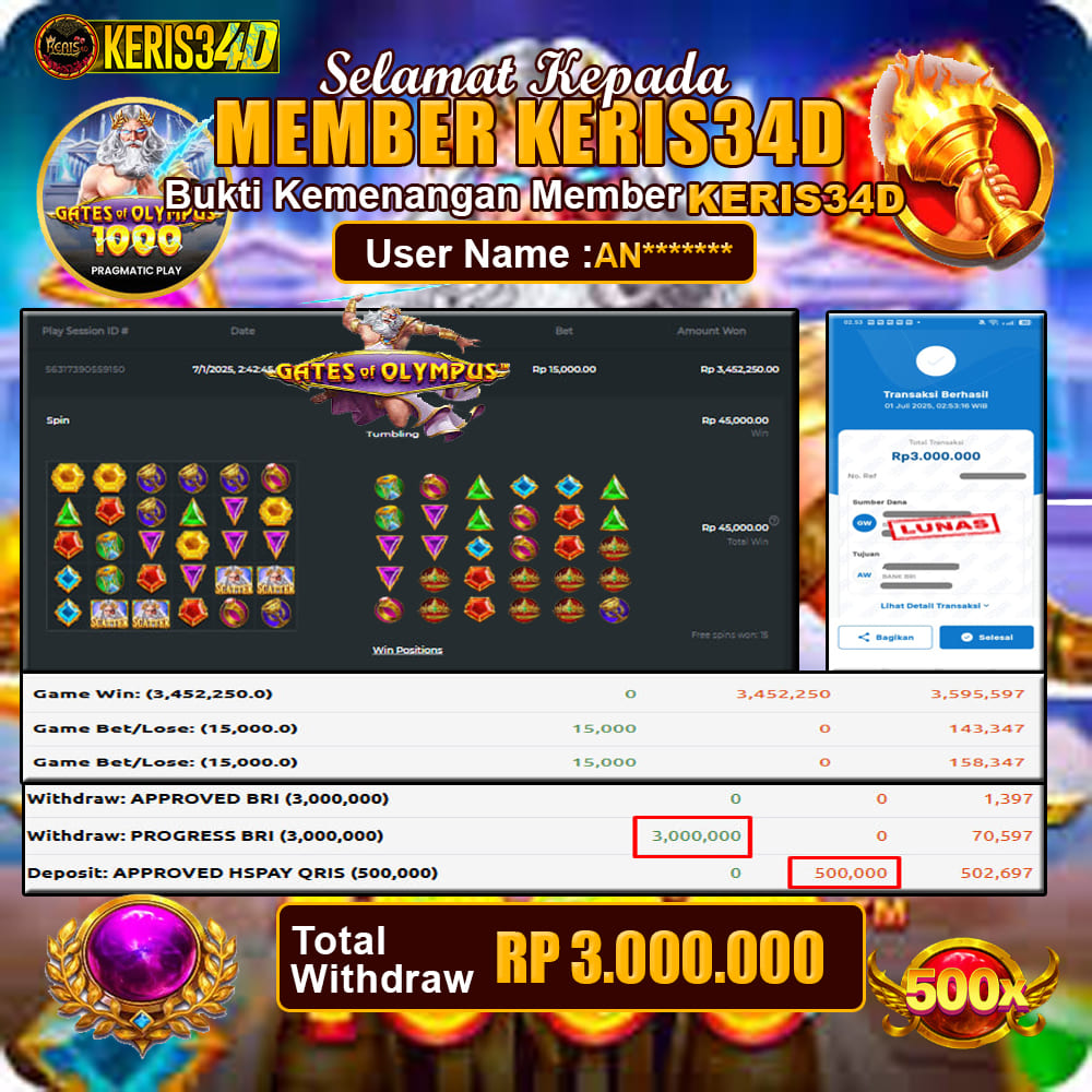 SSetiap hari, member KERIS34D berhasil meraih jackpot besar dari berbagai provider slot ternama yang kami sediakan, seperti Pragmatic Play, Habanero, PG Soft, dan masih banyak lagi. Kami secara rutin menampilkan bukti screenshot atau rekapan kemenangan yang berhasil diraih, mulai dari kemenangan ratusan ribu hingga puluhan juta rupiah. Semua slip kemenangan ini kami hadirkan untuk membuktikan bahwa di KERIS34D peluang menang itu nyata