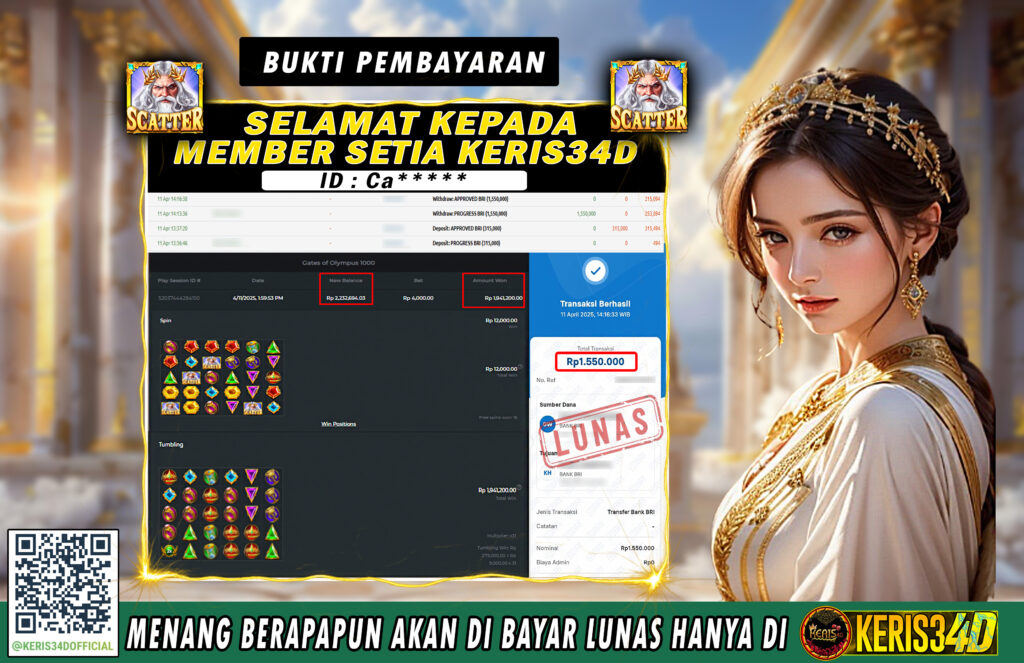 Setiap hari, member KERIS34D berhasil meraih jackpot besar dari berbagai provider slot ternama yang kami sediakan, seperti Pragmatic Play, Habanero, PG Soft, dan masih banyak lagi. Kami secara rutin menampilkan bukti screenshot atau rekapan kemenangan yang berhasil diraih, mulai dari kemenangan ratusan ribu hingga puluhan juta rupiah. Semua slip kemenangan ini kami hadirkan untuk membuktikan bahwa di KERIS34D, peluang menang itu nyata
