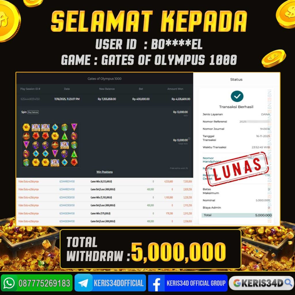Setiap hari, member KERIS34D berhasil meraih jackpot besar dari berbagai provider slot ternama yang kami sediakan, seperti Pragmatic Play, Habanero, PG Soft, dan masih banyak lagi. Kami secara rutin menampilkan bukti screenshot atau rekapan kemenangan yang berhasil diraih, mulai dari kemenangan ratusan ribu hingga puluhan juta rupiah. Semua slip kemenangan ini kami hadirkan untuk membuktikan bahwa di KERIS34D, peluang menang itu nyata