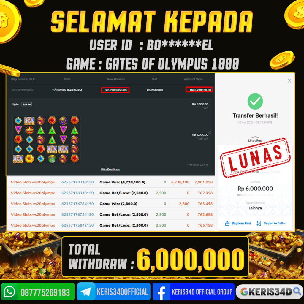 Setiap hari, member KERIS34D berhasil meraih jackpot besar dari berbagai provider slot ternama yang kami sediakan, seperti Pragmatic Play, Habanero, PG Soft, dan masih banyak lagi. Kami secara rutin menampilkan bukti screenshot atau rekapan kemenangan yang berhasil diraih, mulai dari kemenangan ratusan ribu hingga puluhan juta rupiah. Semua slip kemenangan ini kami hadirkan untuk membuktikan bahwa di KERIS34D, peluang menang itu nyata