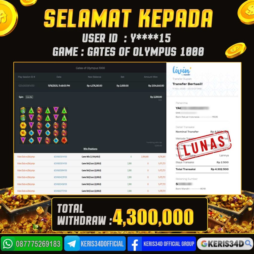 Setiap hari, member KERIS34D berhasil meraih jackpot besar dari berbagai provider slot ternama yang kami sediakan, seperti Pragmatic Play, Habanero, PG Soft, dan masih banyak lagi. Kami secara rutin menampilkan bukti screenshot atau rekapan kemenangan yang berhasil diraih, mulai dari kemenangan ratusan ribu hingga puluhan juta rupiah. Semua slip kemenangan ini kami hadirkan untuk membuktikan bahwa di KERIS34D, peluang menang itu nyata
