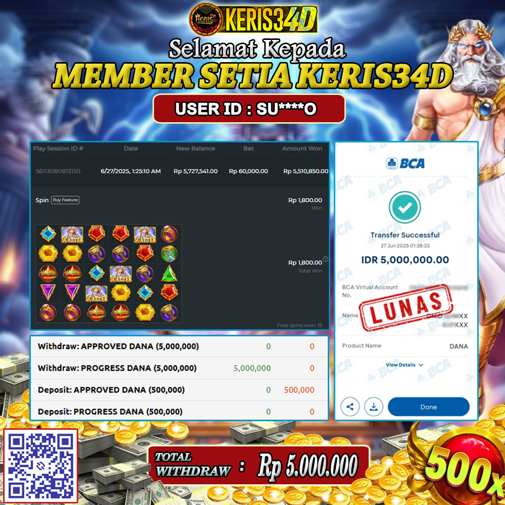 KERIS34D dikenal sebagai situs terpercaya yang selalu menghadirkan pengalaman bermain slot online yang aman, fair, dan berlisensi resmi. Di sini, kami tidak hanya sekadar memberikan janji, tapi bukti nyata berupa slip kemenangan yang dapat Anda lihat secara langsung.