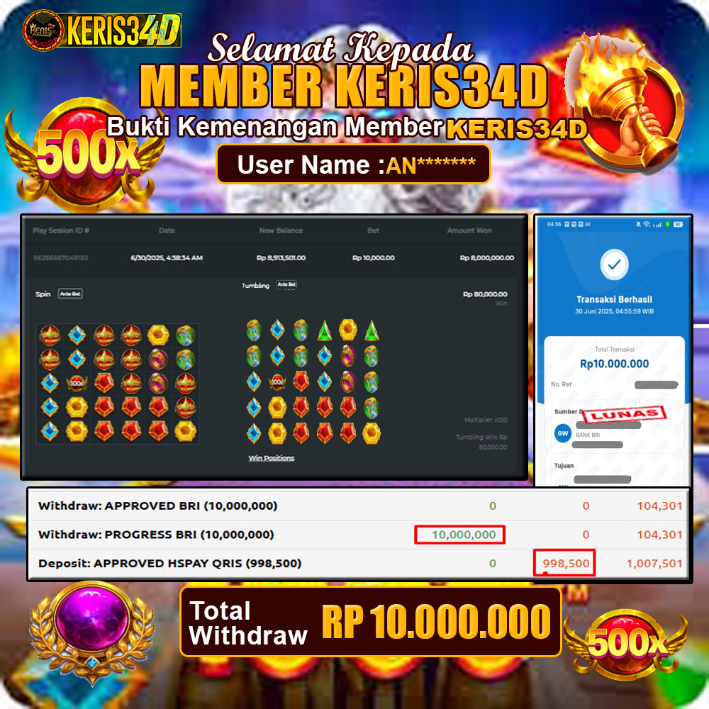 SSetiap hari, member KERIS34D berhasil meraih jackpot besar dari berbagai provider slot ternama yang kami sediakan, seperti Pragmatic Play, Habanero, PG Soft, dan masih banyak lagi. Kami secara rutin menampilkan bukti screenshot atau rekapan kemenangan yang berhasil diraih, mulai dari kemenangan ratusan ribu hingga puluhan juta rupiah. Semua slip kemenangan ini kami hadirkan untuk membuktikan bahwa di KERIS34D peluang menang itu nyata