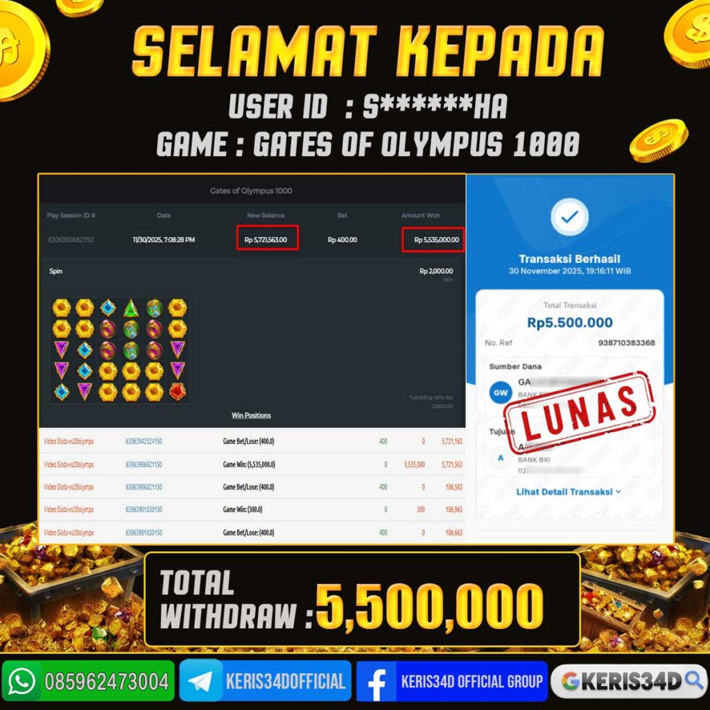 Setiap hari, member KERIS34D berhasil meraih jackpot besar dari berbagai provider slot ternama yang kami sediakan, seperti Pragmatic Play, Habanero, PG Soft, dan masih banyak lagi. Kami secara rutin menampilkan bukti screenshot atau rekapan kemenangan yang berhasil diraih, mulai dari kemenangan ratusan ribu hingga puluhan juta rupiah. Semua slip kemenangan ini kami hadirkan untuk membuktikan bahwa di KERIS34D, peluang menang itu nyata