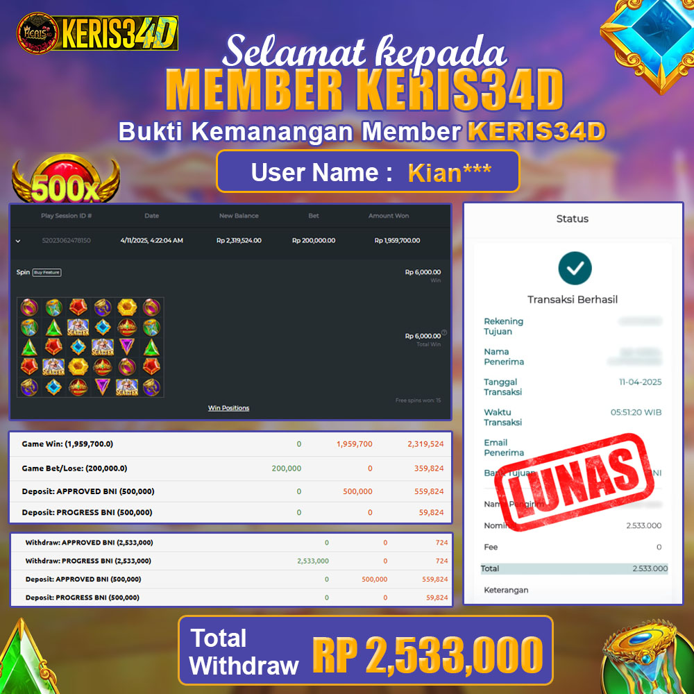 Setiap hari, member KERIS34D berhasil meraih jackpot besar dari berbagai provider slot ternama yang kami sediakan, seperti Pragmatic Play, Habanero, PG Soft, dan masih banyak lagi. Kami secara rutin menampilkan bukti screenshot atau rekapan kemenangan yang berhasil diraih, mulai dari kemenangan ratusan ribu hingga puluhan juta rupiah. Semua slip kemenangan ini kami hadirkan untuk membuktikan bahwa di KERIS34D, peluang menang itu nyata