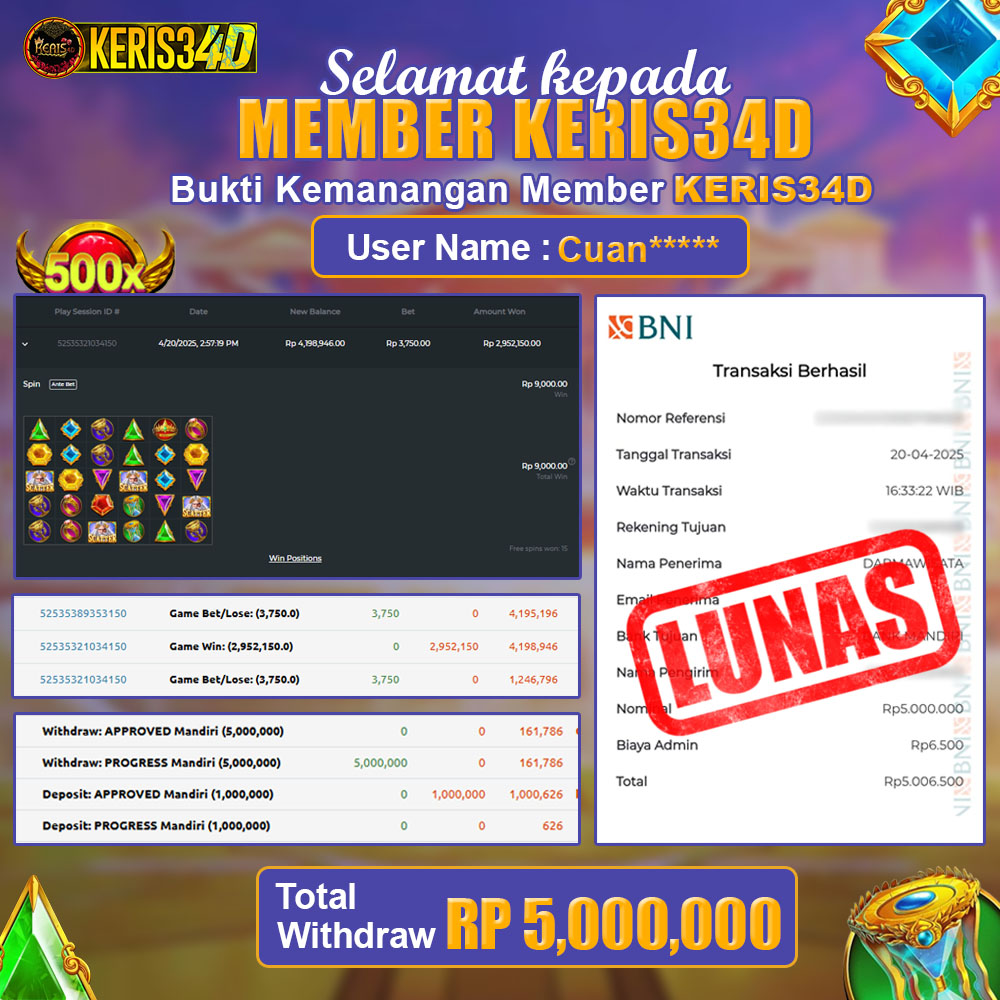 Setiap hari, member KERIS34D berhasil meraih jackpot besar dari berbagai provider slot ternama yang kami sediakan, seperti Pragmatic Play, Habanero, PG Soft, dan masih banyak lagi. Kami secara rutin menampilkan bukti screenshot atau rekapan kemenangan yang berhasil diraih, mulai dari kemenangan ratusan ribu hingga puluhan juta rupiah. Semua slip kemenangan ini kami hadirkan untuk membuktikan bahwa di KERIS34D, peluang menang itu nyata