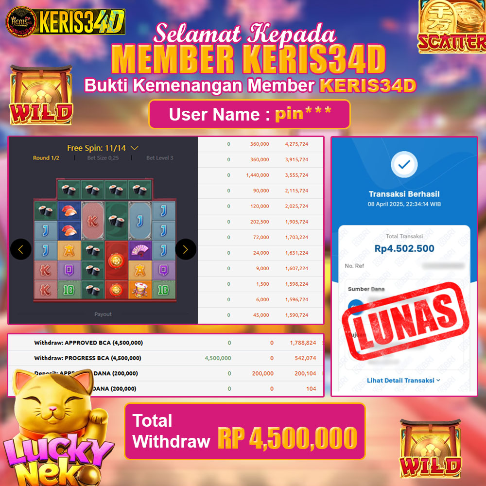 Setiap hari, member KERIS34D berhasil meraih jackpot besar dari berbagai provider slot ternama yang kami sediakan, seperti Pragmatic Play, Habanero, PG Soft, dan masih banyak lagi. Kami secara rutin menampilkan bukti screenshot atau rekapan kemenangan yang berhasil diraih, mulai dari kemenangan ratusan ribu hingga puluhan juta rupiah. Semua slip kemenangan ini kami hadirkan untuk membuktikan bahwa di KERIS34D, peluang menang itu nyata