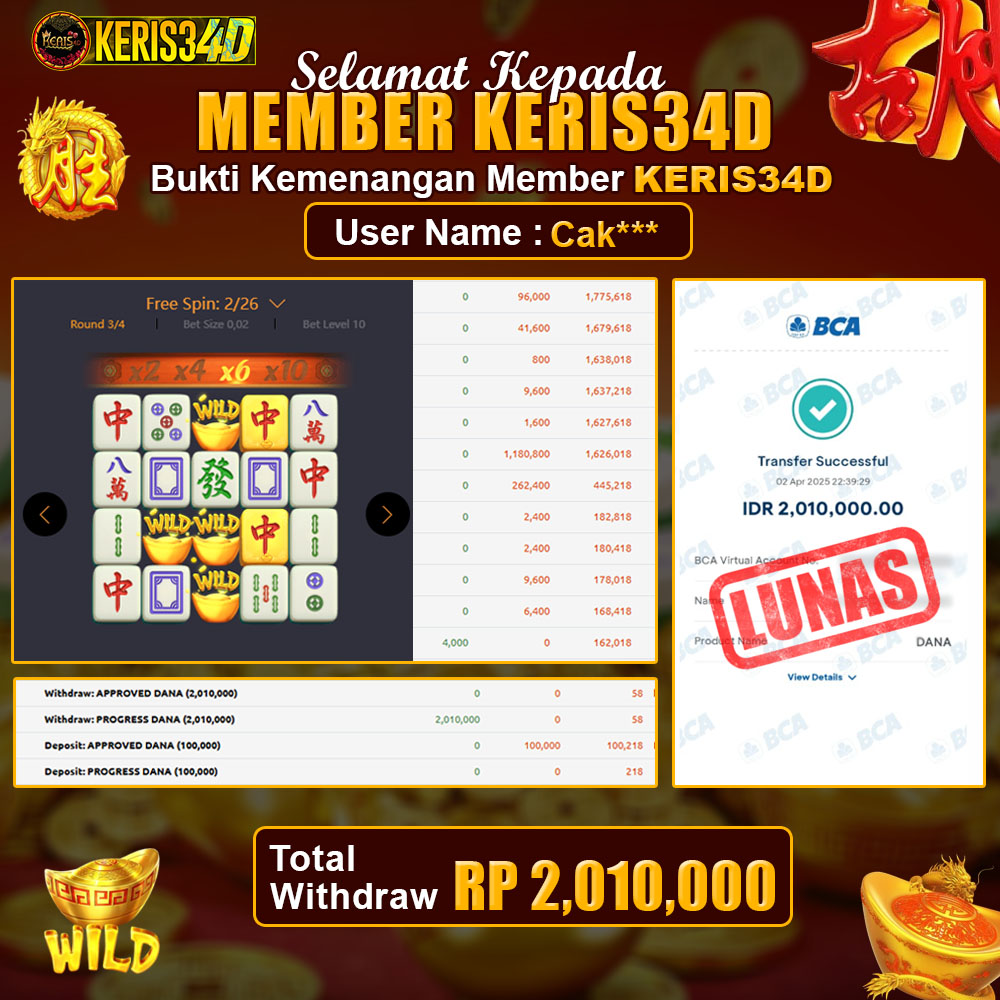 Setiap hari, member KERIS34D berhasil meraih jackpot besar dari berbagai provider slot ternama yang kami sediakan, seperti Pragmatic Play, Habanero, PG Soft, dan masih banyak lagi. Kami secara rutin menampilkan bukti screenshot atau rekapan kemenangan yang berhasil diraih, mulai dari kemenangan ratusan ribu hingga puluhan juta rupiah. Semua slip kemenangan ini kami hadirkan untuk membuktikan bahwa di KERIS34D, peluang menang itu nyata