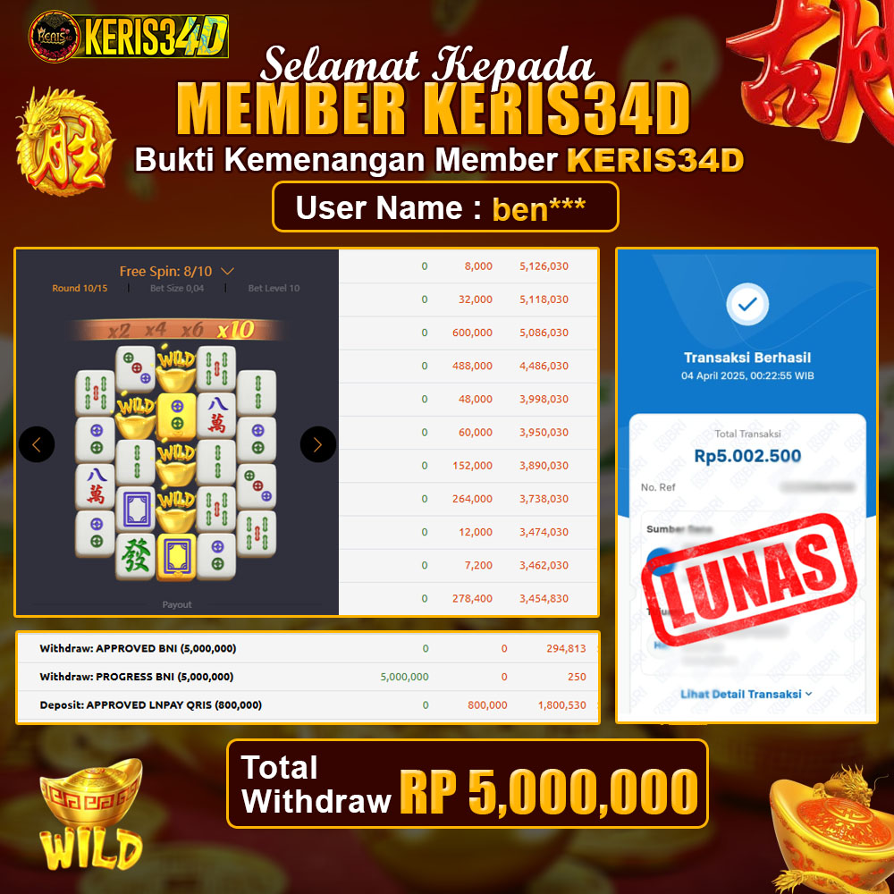 Setiap hari, member KERIS34D berhasil meraih jackpot besar dari berbagai provider slot ternama yang kami sediakan, seperti Pragmatic Play, Habanero, PG Soft, dan masih banyak lagi. Kami secara rutin menampilkan bukti screenshot atau rekapan kemenangan yang berhasil diraih, mulai dari kemenangan ratusan ribu hingga puluhan juta rupiah. Semua slip kemenangan ini kami hadirk