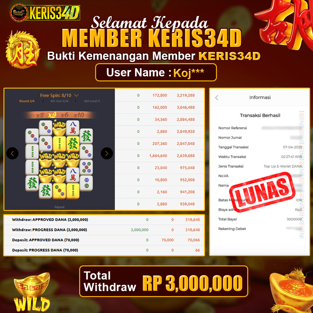 Setiap hari, member KERIS34D berhasil meraih jackpot besar dari berbagai provider slot ternama yang kami sediakan, seperti Pragmatic Play, Habanero, PG Soft, dan masih banyak lagi. Kami secara rutin menampilkan bukti screenshot atau rekapan kemenangan yang berhasil diraih, mulai dari kemenangan ratusan ribu hingga puluhan juta rupiah. Semua slip kemenangan ini kami hadirkan untuk membuktikan bahwa di KERIS34D, peluang menang itu nyata