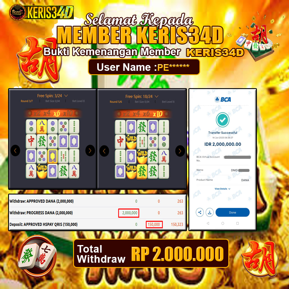 Setiap hari, member KERIS34D berhasil meraih jackpot besar dari berbagai provider slot ternama yang kami sediakan, seperti Pragmatic Play, Habanero, PG Soft, dan masih banyak lagi. Kami secara rutin menampilkan bukti screenshot atau rekapan kemenangan yang berhasil diraih, mulai dari kemenangan ratusan ribu hingga puluhan juta rupiah. Semua slip kemenangan ini kami hadirkan untuk membuktikan bahwa di KERIS34D, peluang menang itu nyata