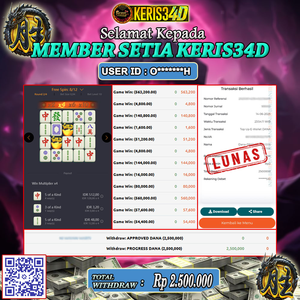 Setiap hari, member KERIS34D berhasil meraih jackpot besar dari berbagai provider slot ternama yang kami sediakan, seperti Pragmatic Play, Habanero, PG Soft, dan masih banyak lagi. Kami secara rutin menampilkan bukti screenshot atau rekapan kemenangan yang berhasil diraih, mulai dari kemenangan ratusan ribu hingga puluhan juta rupiah. Semua slip kemenangan ini kami hadirkan untuk membuktikan bahwa di KERIS34D, peluang menang itu nyata
