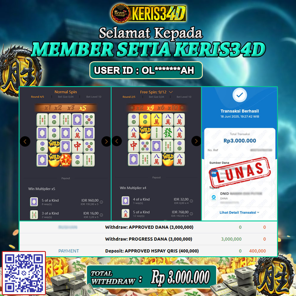Setiap hari, member KERIS34D berhasil meraih jackpot besar dari berbagai provider slot ternama yang kami sediakan, seperti Pragmatic Play, Habanero, PG Soft, dan masih banyak lagi. Kami secara rutin menampilkan bukti screenshot atau rekapan kemenangan yang berhasil diraih, mulai dari kemenangan ratusan ribu hingga puluhan juta rupiah. Semua slip kemenangan ini kami hadirkan untuk membuktikan bahwa di KERIS34D, peluang menang itu nyata