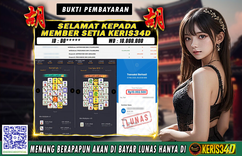 KERIS34D dikenal sebagai situs terpercaya yang selalu menghadirkan pengalaman bermain slot online yang aman, fair, dan berlisensi resmi. Di sini, kami tidak hanya sekadar memberikan janji, tapi bukti nyata berupa slip kemenangan yang dapat Anda lihat secara langsung.
