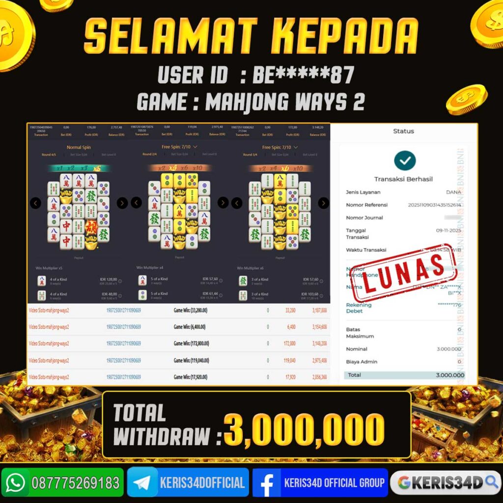 KERIS34D dikenal sebagai situs terpercaya yang selalu menghadirkan pengalaman bermain slot online yang aman, fair, dan berlisensi resmi. Di sini, kami tidak hanya sekadar memberikan janji, tapi bukti nyata berupa slip kemenangan yang dapat Anda lihat secara langsung.