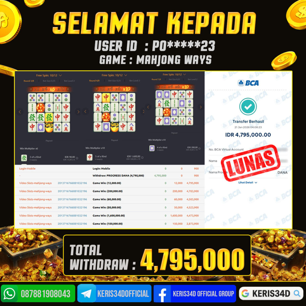 KERIS34D dikenal sebagai situs terpercaya yang selalu menghadirkan pengalaman bermain slot online yang aman, fair, dan berlisensi resmi. Di sini, kami tidak hanya sekadar memberikan janji, tapi bukti nyata berupa slip kemenangan yang dapat Anda lihat secara langsung.