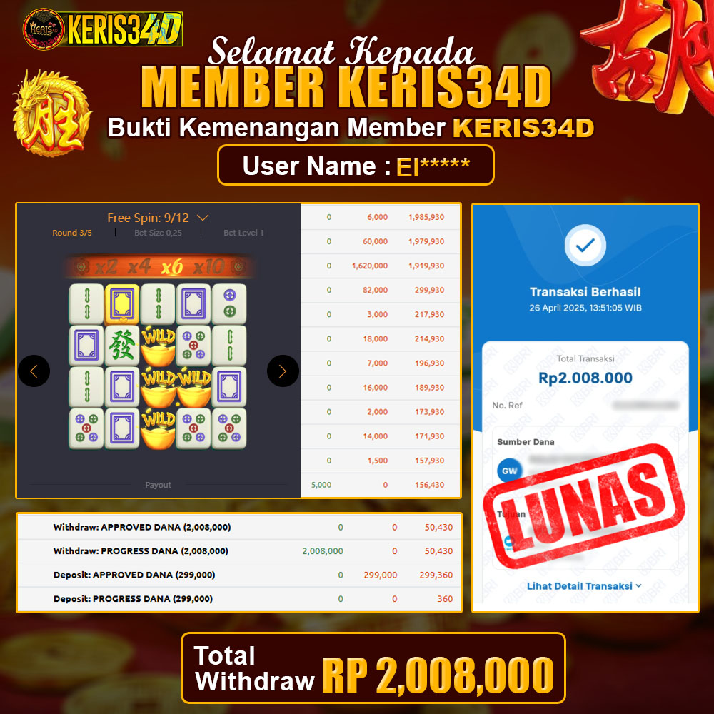 Setiap hari, member KERIS34D berhasil meraih jackpot besar dari berbagai provider slot ternama yang kami sediakan, seperti Pragmatic Play, Habanero, PG Soft, dan masih banyak lagi. Kami secara rutin menampilkan bukti screenshot atau rekapan kemenangan yang berhasil diraih, mulai dari kemenangan ratusan ribu hingga puluhan juta rupiah. Semua slip kemenangan ini kami hadirkan untuk membuktikan bahwa di KERIS34D, peluang menang itu nyata