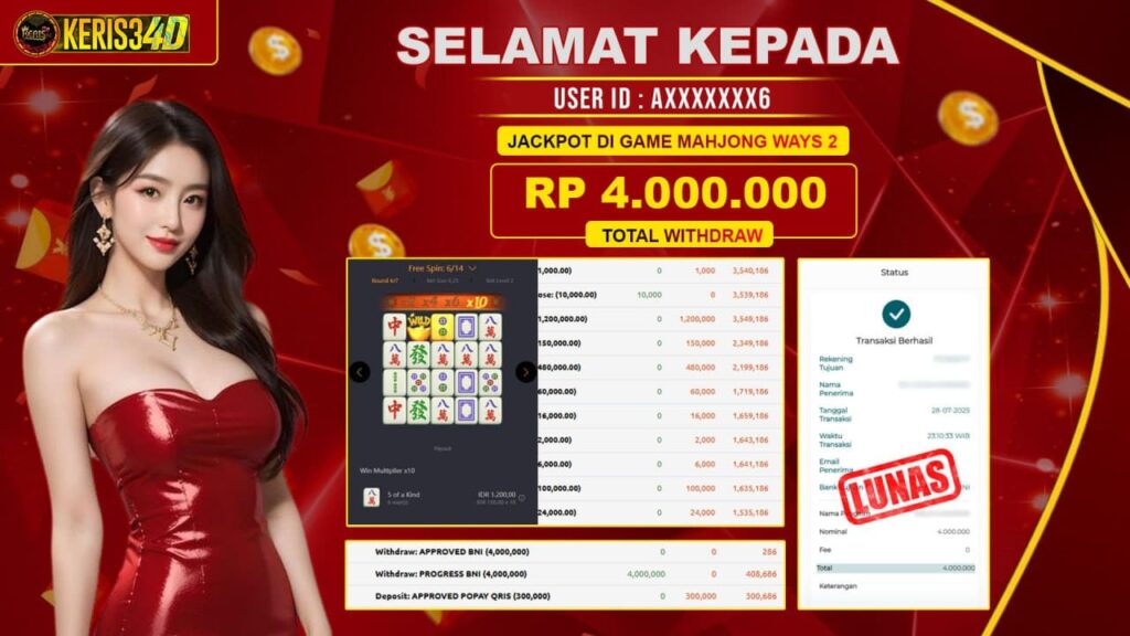 KERIS34D dikenal sebagai situs terpercaya yang selalu menghadirkan pengalaman bermain slot online yang aman, fair, dan berlisensi resmi. Di sini, kami tidak hanya sekadar memberikan janji, tapi bukti nyata berupa slip kemenangan yang dapat Anda lihat secara langsung.