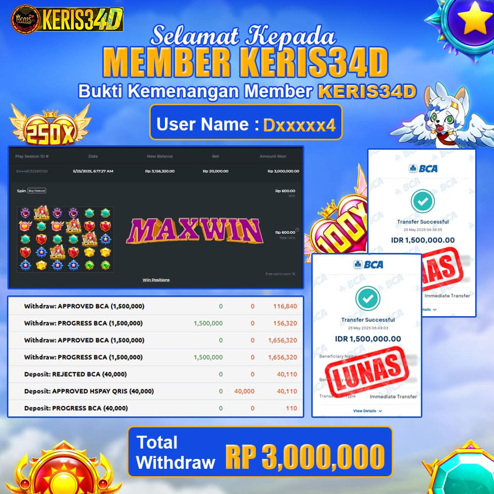 SSetiap hari, member KERIS34D berhasil meraih jackpot besar dari berbagai provider slot ternama yang kami sediakan, seperti Pragmatic Play, Habanero, PG Soft, dan masih banyak lagi. Kami secara rutin menampilkan bukti screenshot atau rekapan kemenangan yang berhasil diraih, mulai dari kemenangan ratusan ribu hingga puluhan juta rupiah. Semua slip kemenangan ini kami hadirkan untuk membuktikan bahwa di KERIS34D, peluang menang itu nyata