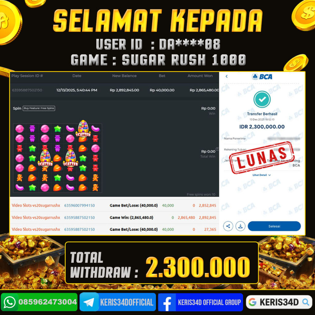 JACKPOT SLOT GACOR SUGAR RUSH 1000 13 DESEMBER2025, Jackpot Slot Gacor, Kemenangan Slot, Bukti Kemenangan Slot, Kemenangan PRAGMATIC PLAY, Menang Slot online, Slot Gacor, Situs Aman Terpercaya, WD Berapapun Pasti DI Bayar Tuntas, Maxwin Slot Online.