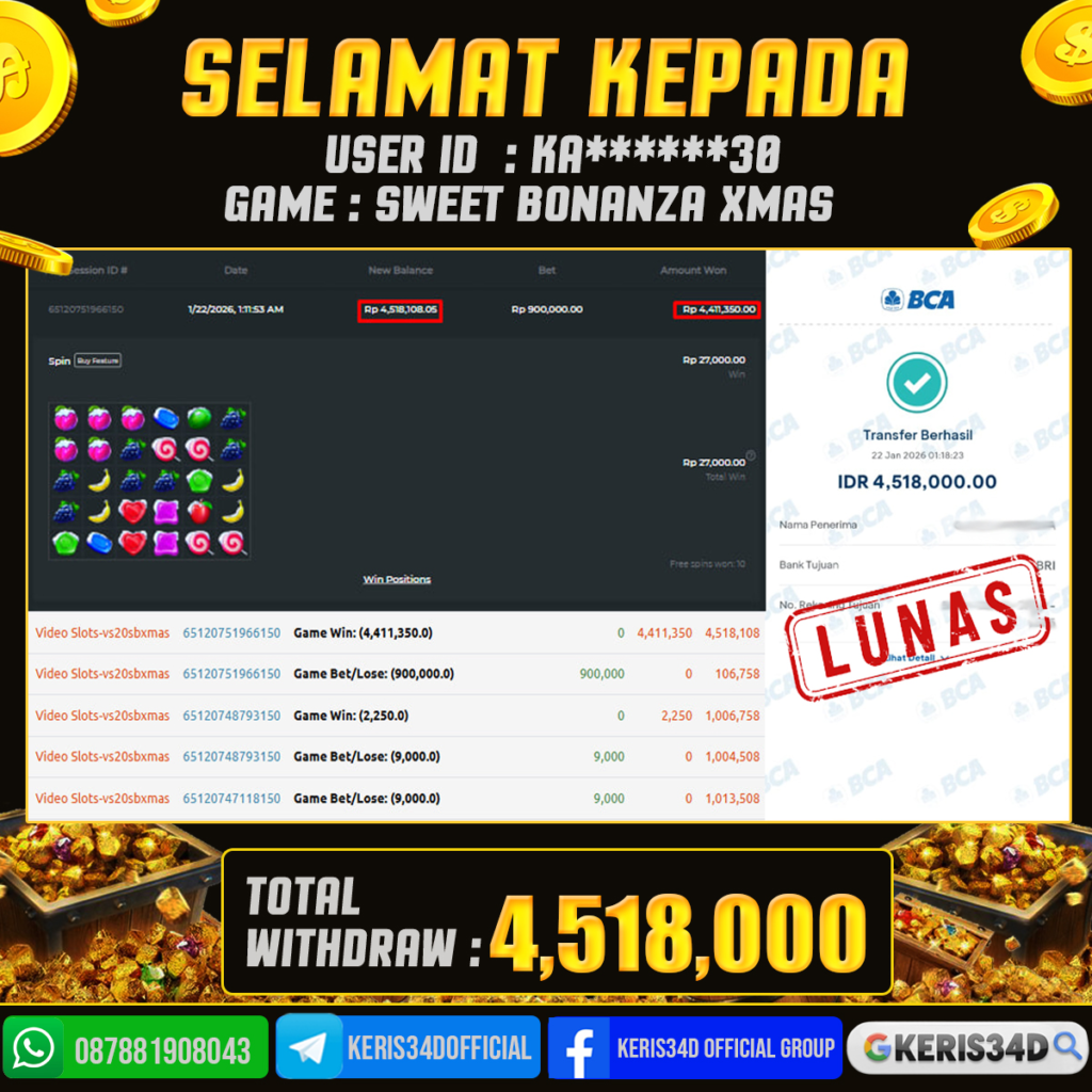 KERIS34D dikenal sebagai situs terpercaya yang selalu menghadirkan pengalaman bermain slot online yang aman, fair, dan berlisensi resmi. Di sini, kami tidak hanya sekadar memberikan janji, tapi bukti nyata berupa slip kemenangan yang dapat Anda lihat secara langsung.