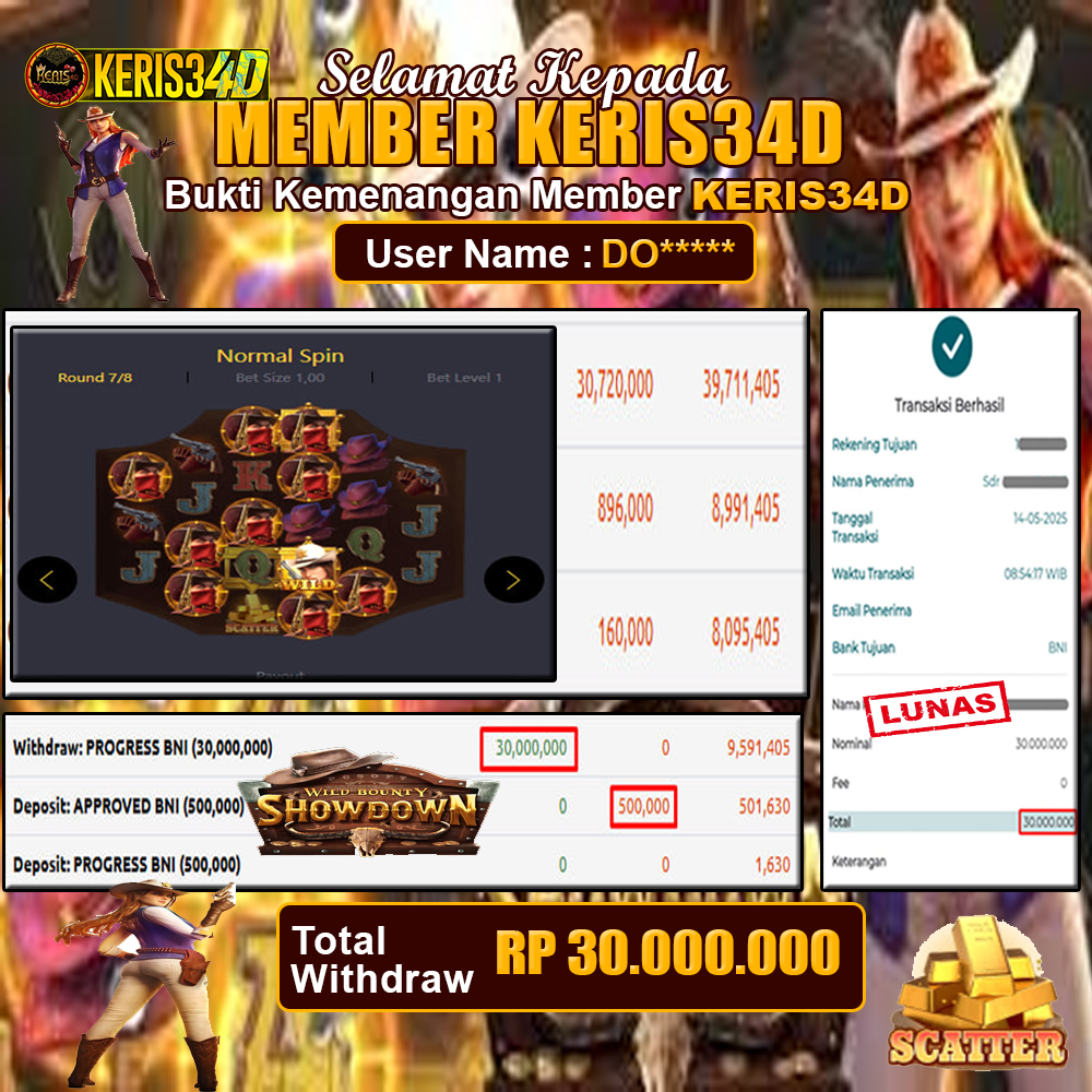 Setiap hari, member KERIS34D berhasil meraih jackpot besar dari berbagai provider slot ternama yang kami sediakan, seperti Pragmatic Play, Habanero, PG Soft, dan masih banyak lagi. Kami secara rutin menampilkan bukti screenshot atau rekapan kemenangan yang berhasil diraih, mulai dari kemenangan ratusan ribu hingga puluhan juta rupiah. Semua slip kemenangan ini kami ha