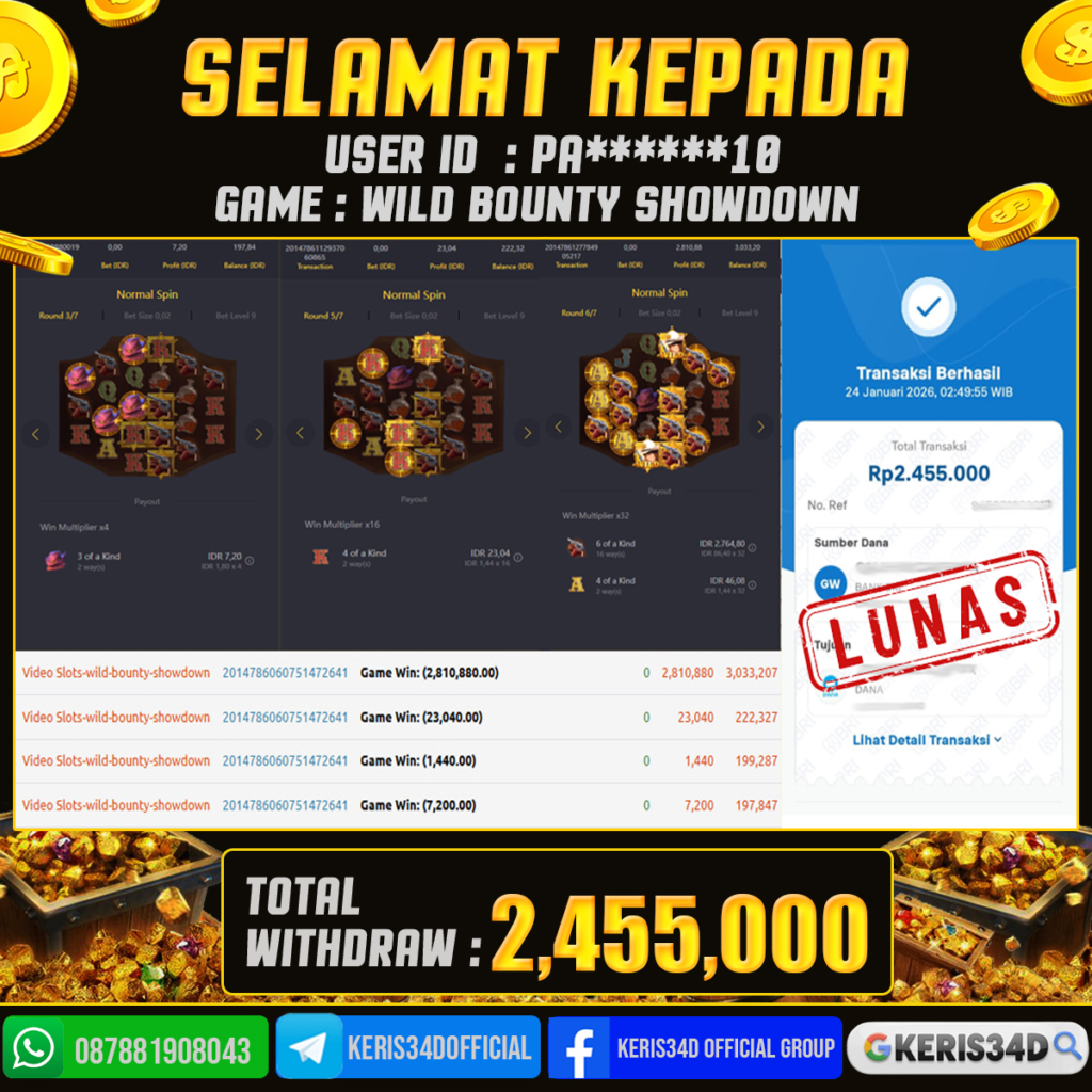 JACKPOT SLOT GACOR MAIN WILD BOUNTY SHOWDOWN 24 JANUARI 2026, Jackpot Slot Gacor, Kemenangan Slot, Bukti Kemenangan Slot, Kemenangan PGSOFT, Menang Slot online, Slot Gacor, Situs Aman Terpercaya, WD Berapapun Pasti DI Bayar Tuntas, Maxwin Slot Online.