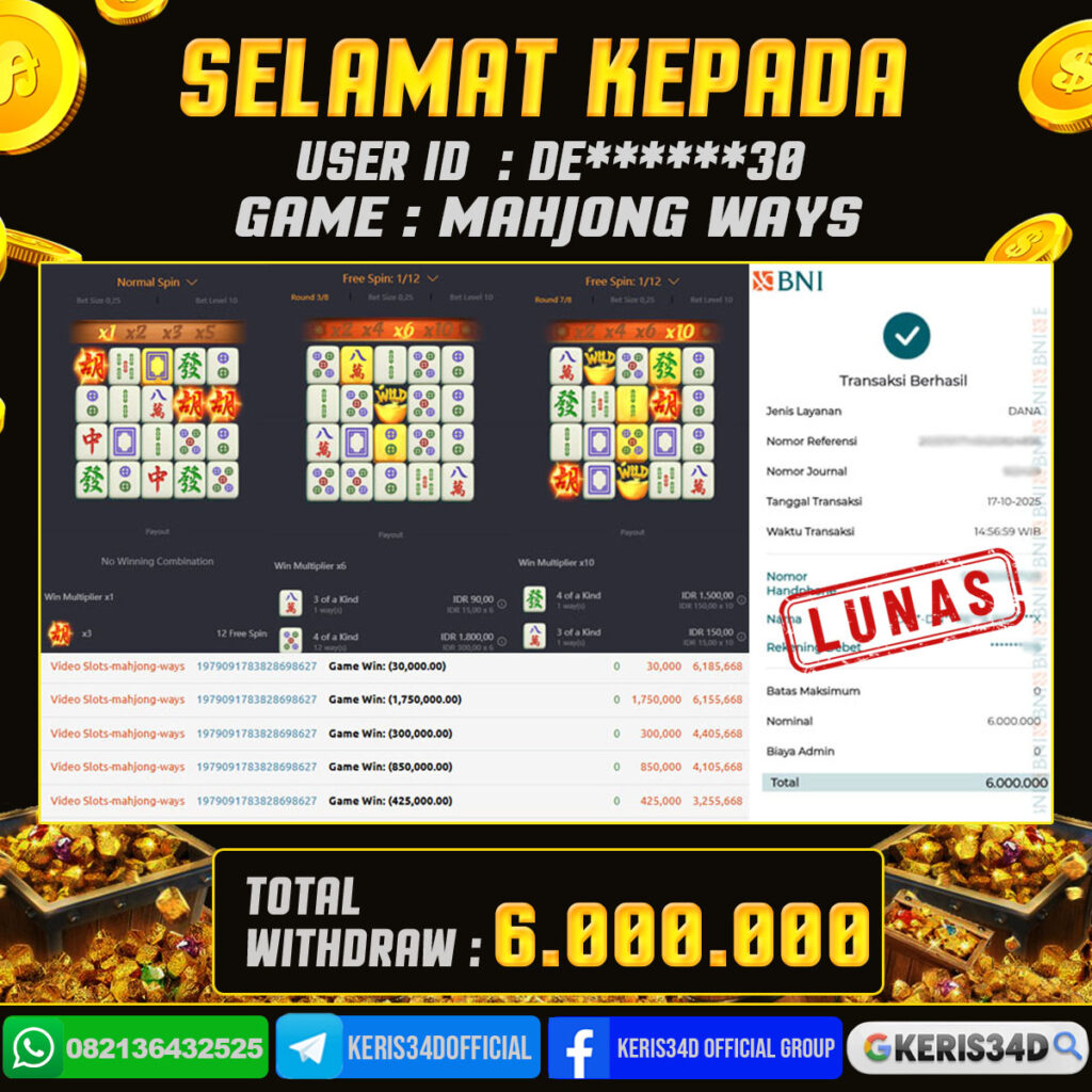 Setiap hari, member KERIS34D berhasil meraih jackpot besar dari berbagai provider slot ternama yang kami sediakan, seperti Pragmatic Play, Habanero, PG Soft, dan masih banyak lagi. Kami secara rutin menampilkan bukti screenshot atau rekapan kemenangan yang berhasil diraih, mulai dari kemenangan ratusan ribu hingga puluhan juta rupiah. Semua slip kemenangan ini kami hadirkan untuk membuktikan bahwa di KERIS34D, peluang menang itu nyata
