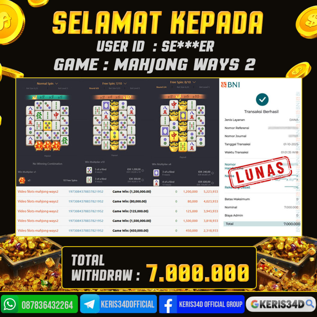 Setiap hari, member KERIS34D berhasil meraih jackpot besar dari berbagai provider slot ternama yang kami sediakan, seperti Pragmatic Play, Habanero, PG Soft, dan masih banyak lagi. Kami secara rutin menampilkan bukti screenshot atau rekapan kemenangan yang berhasil diraih, mulai dari kemenangan ratusan ribu hingga puluhan juta rupiah. Semua slip kemenangan ini kami hadirkan untuk membuktikan bahwa di KERIS34D, peluang menang itu nyata